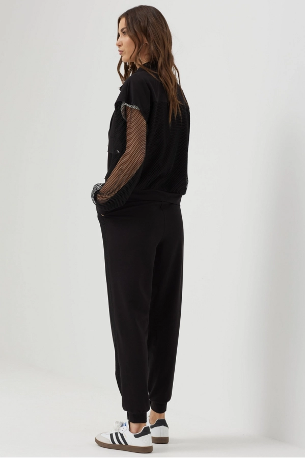 Брюки полуприлегающего кроя из комфортного трикотажного полотна комбинированного трикотажной сеткой. По верху притачной пояс, частично на резинке. По переду наклонные карманы и вставка из отделочной ткани(сетка). По низу брюк притачные манжеты.