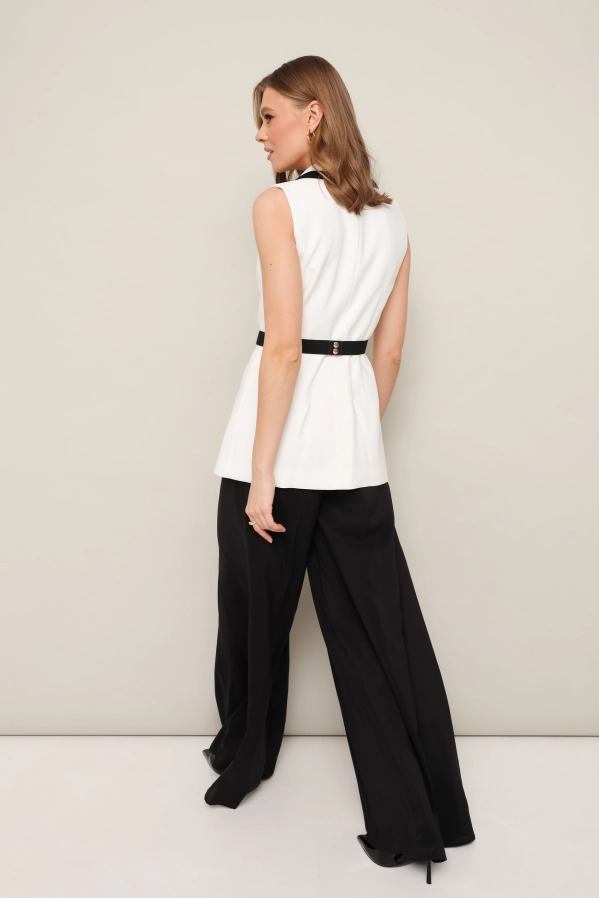 Элегантный комплект, состоящий из жилета и брюкпалаццо. Жилет полуприлегающего силуэта на х/б подкладке с воротником пиджачного типа с контрастной окантовкой. Центральная застежка на потайные кнопки. Перед с рельефами, переходящими в разрезы в нижней части жилета. Струящиеся брюки-палаццо свободного силуэта с расклешением от бедра, на притачном поясе, с застёжкой на потайную молнию в боковом шве. Брюки на частичной подкладке. В комплекте прилагается акцентный пояс на резинке с застежкой на кнопки.