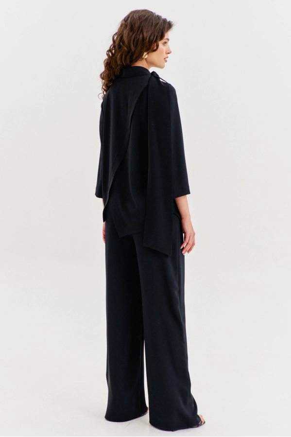 Комплект, состоящий из блузки и брюк. Блузка свободного кроя с фигурной линией низа. Спинка с наклонным швом с цельнокроеной планкой. Перед на запах, ассиметричный. Правый перед с воротником апаш, по борту вставлен широкий пояс. Левый перед с воротником шаль с длинным отлетным краем. По левому переду настрочена шлевка. По плечу, с правой стороны настрочена шлевка для отлетного края воротника. Застежка на петли и пуговицы. Рукава одношовные, втачные, длиной 3/4. Брюки длинные, широкие. По задним половинкам талиевые вытачки. По передним половинкам односторонние складки, боковые карманы и застежка на тесьму-«молнию» с гульфиком и откоском. Брюки на притачном поясе, по спинке с резинкой. По поясу вставлены шлевки.
