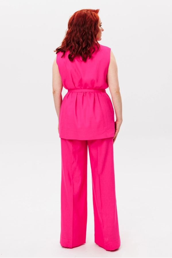 Комплект женский, состоящий из жилетки и брюк. Жилетка прямого силуэта, длиной ниже линии бедер. Спинка с плечевой вытачкой. По переду обработаны карманы с листочкой. Воротник пиджачного типа с лацканами. Двубортная застежка по переду на кнопки. Жилетку дополняет съемный пояс с полукольцами.Брюки прямого силуэта, на притачном поясе с резинкой по спинке. По задним половинкам талиевые вытачки. По передним половинкам застрочены стрелки, обработаны боковые карманы с наклонным входом, и застежка на тесьму-«молнию» с гульфиком и откоском. По поясу застежка на кнопку.