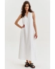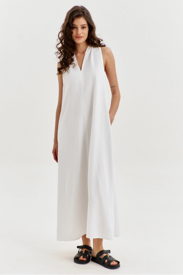 Платье свободного кроя, расширенное к низу, длиной выше щиколотки. Платье по спинке со средним швом, в котором, выше талии обработан разрез на запах. Перед со средним швом, с мягкими складками от плеча. Платье с английской проймой. Горловина V-образной формы. В боковых швах обработаны карманы. Платье на подкладке.