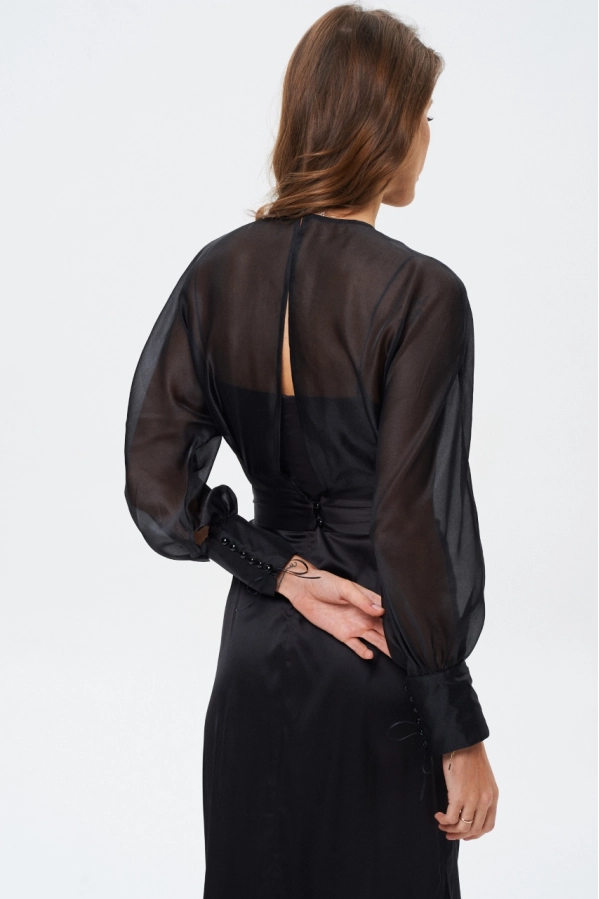 Платье, созданное для тех, кто ценит элегантность, женственность и утончённость. Представлено в чёрном классическом оттенке. Нежное платье комбинация из струящейся ткани, которое прикрыто элегантной блузкой с красивым разрезом, оформленной талией и в меру пышным рукавом на манжете. Блуза съёмная и может служить как отдельный элемент одежды.